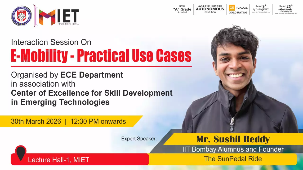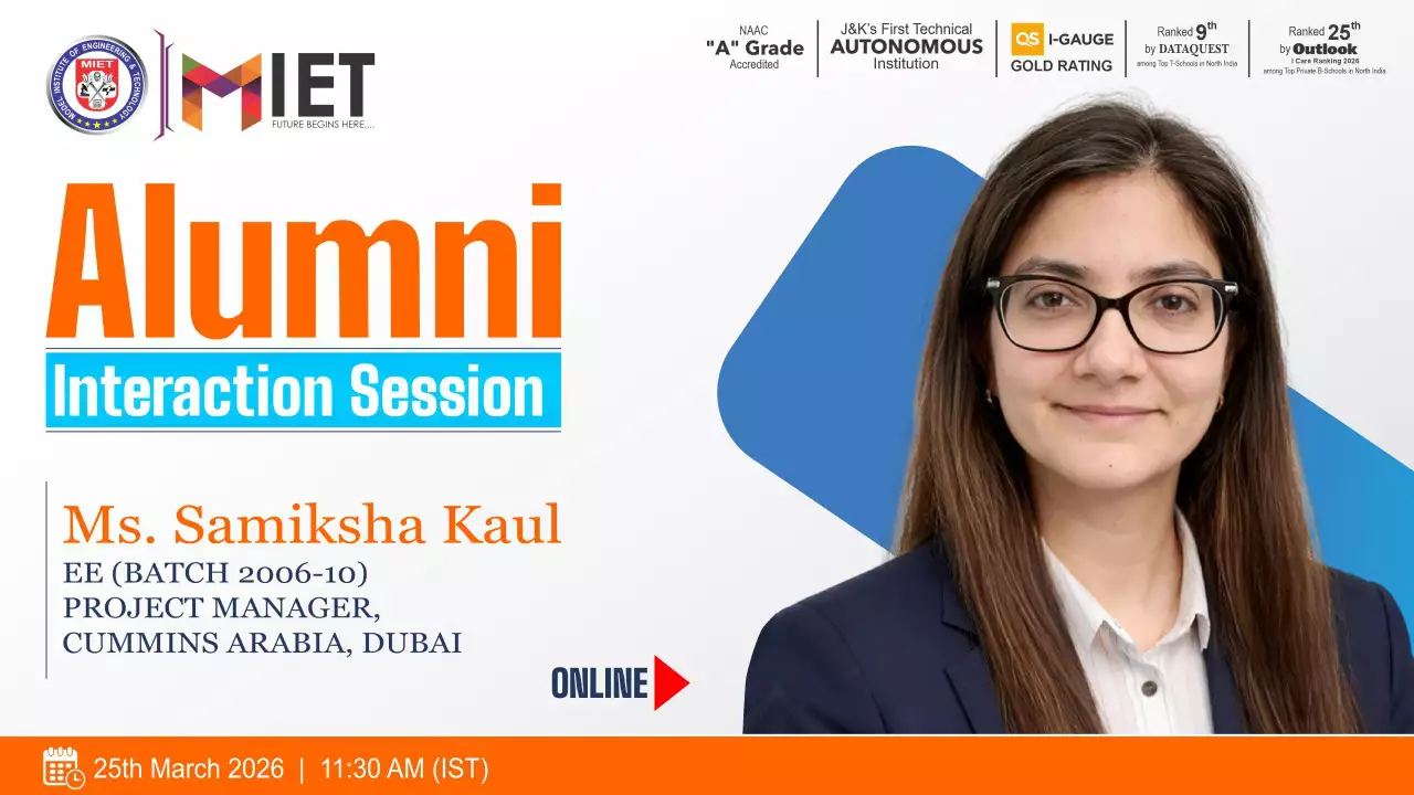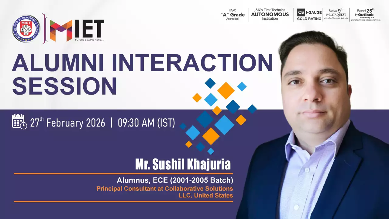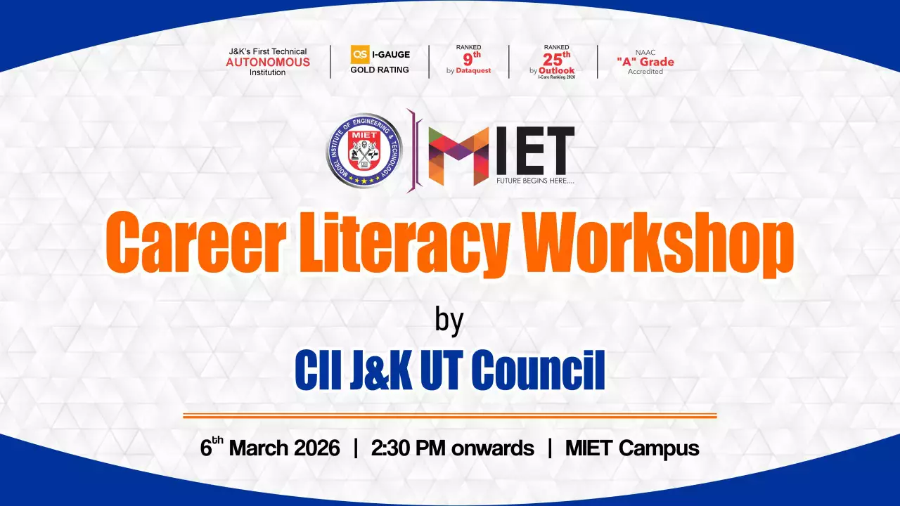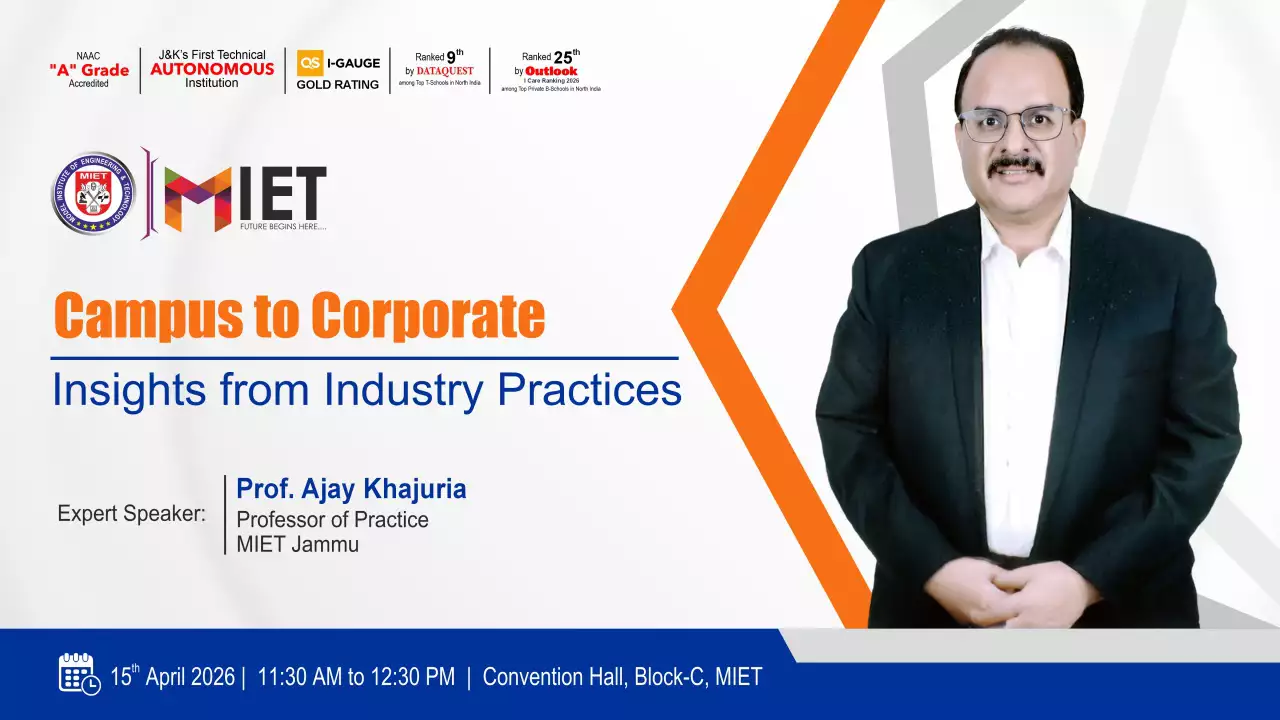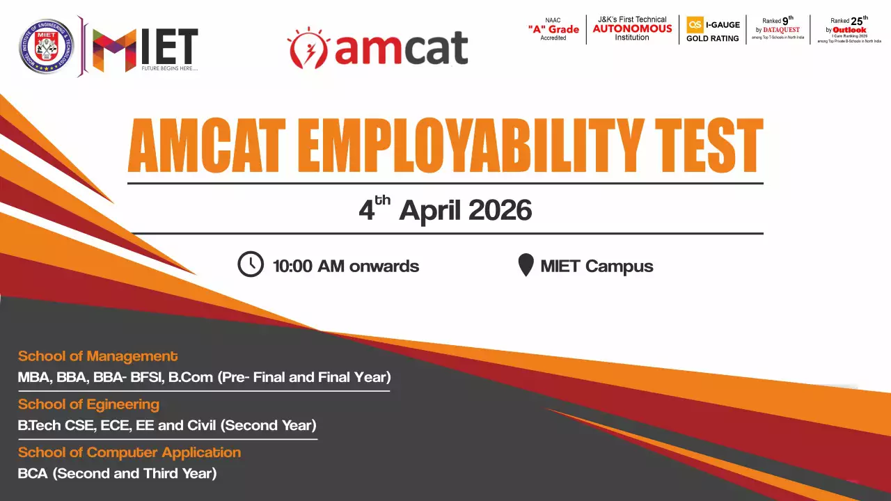 Established in 1999, MIET is the first private engineering college in Jammu and Kashmir. As a UGC approved Autonomous Institution, the institution is committed to fostering academic excellence, innovation, and research. Offering undergraduate, postgraduate, and doctoral programs in Engineering and Technology, Business Administration, Commerce, and Law, the institute emphasizes a cutting-edge curriculum, state-of-the-art infrastructure, and industry collaboration.