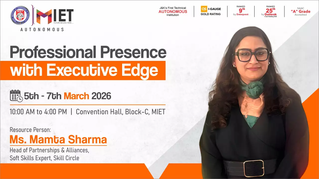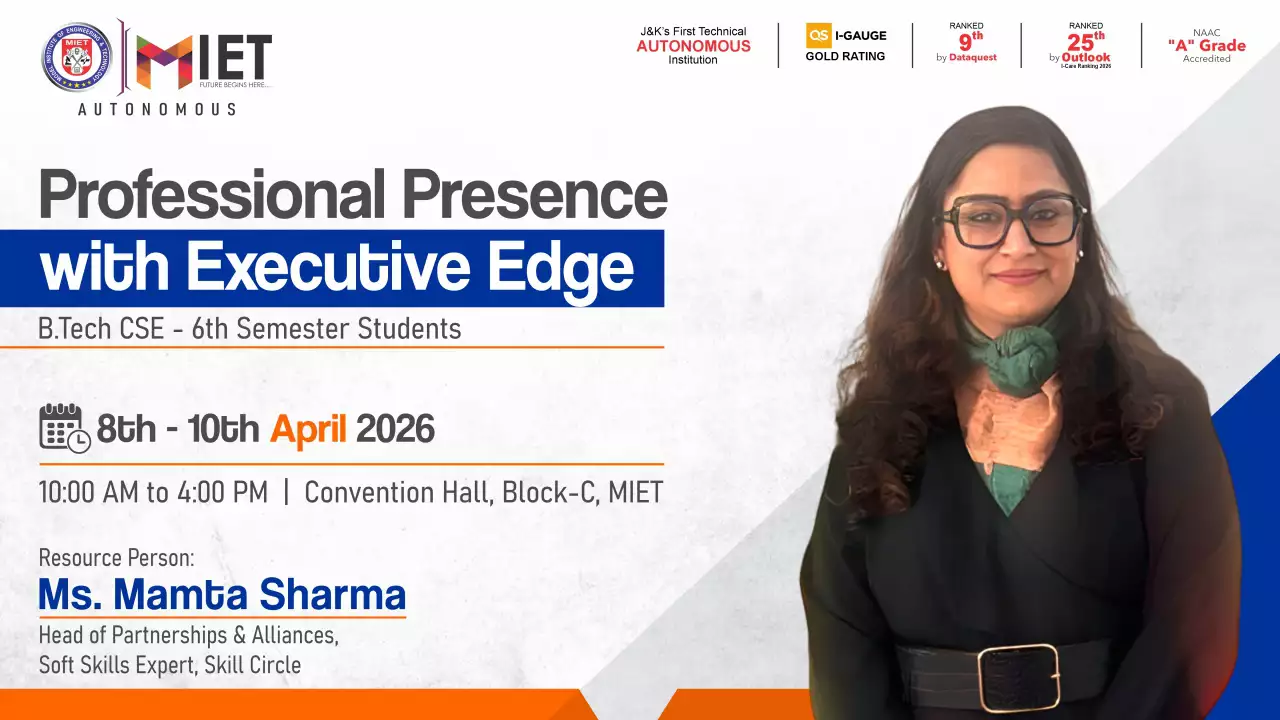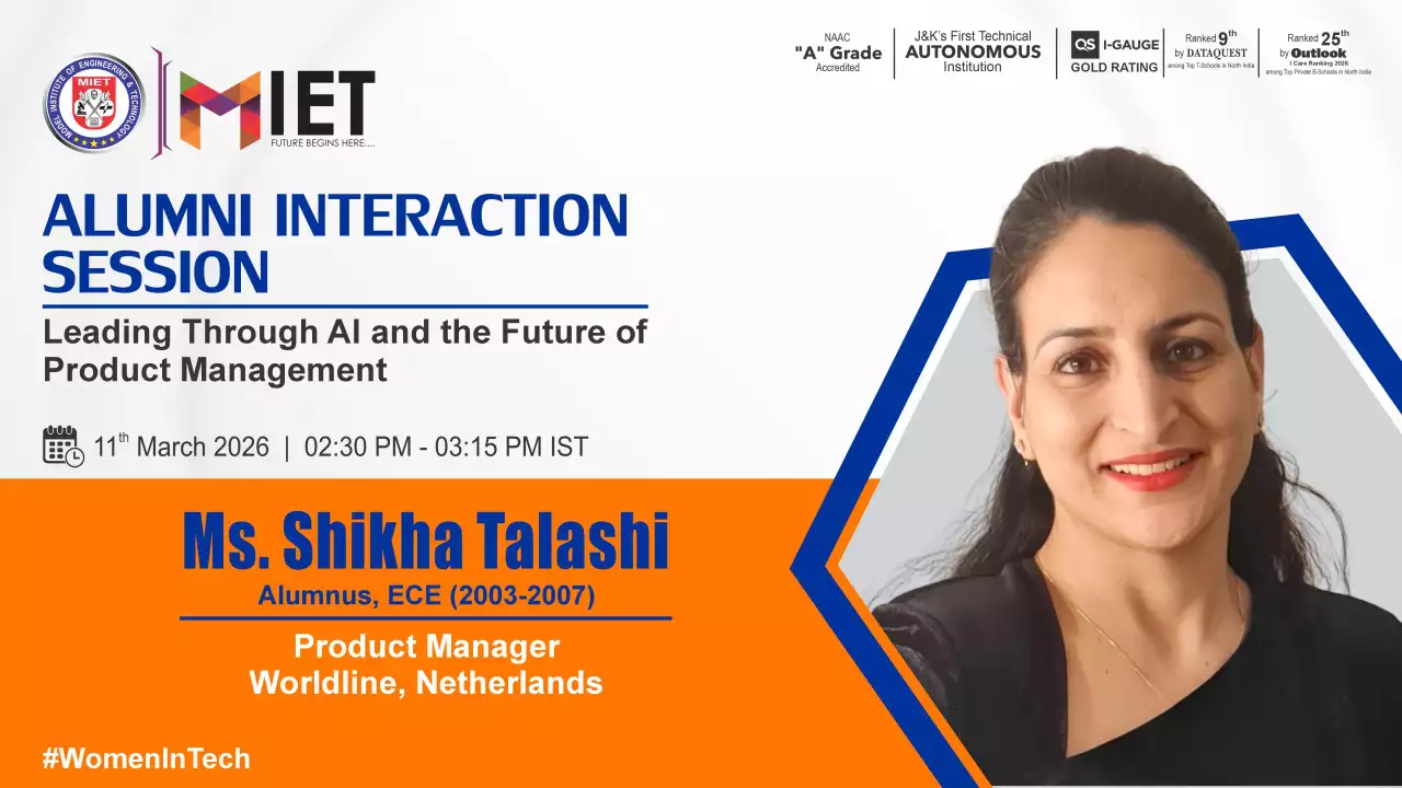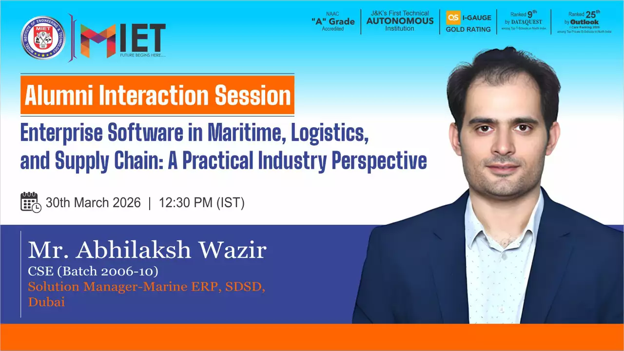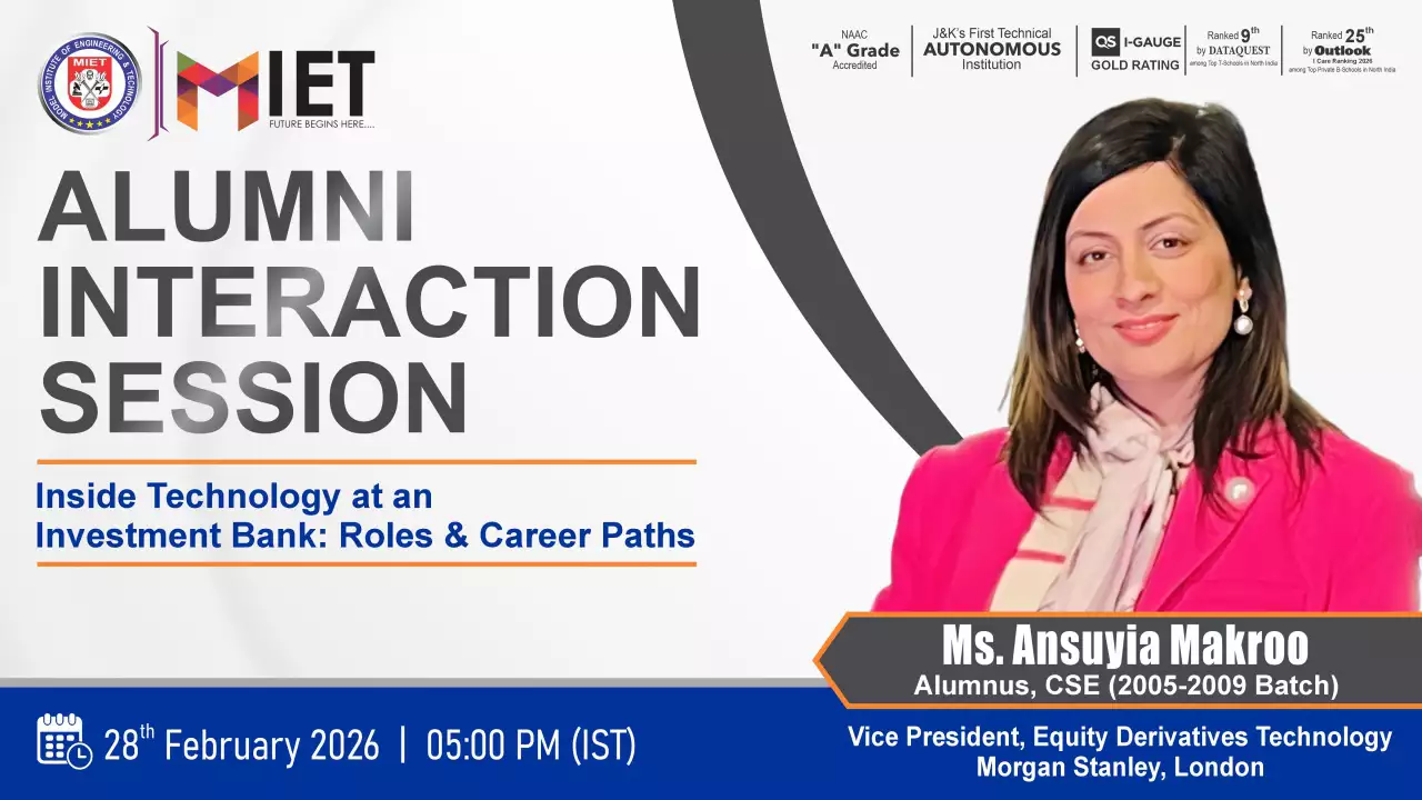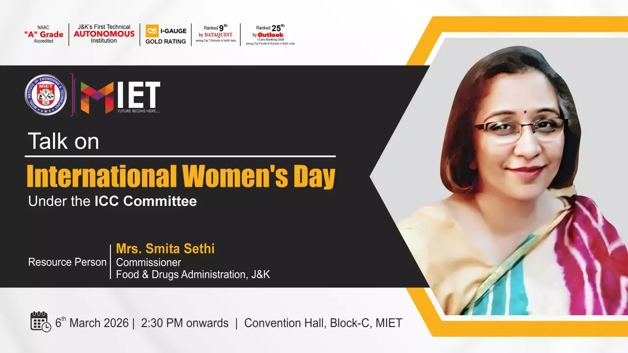 Established in 1999, MIET is the first private engineering college in Jammu and Kashmir. As a UGC approved Autonomous Institution, the institution is committed to fostering academic excellence, innovation, and research. Offering undergraduate, postgraduate, and doctoral programs in Engineering and Technology, Business Administration, Commerce, and Law, the institute emphasizes a cutting-edge curriculum, state-of-the-art infrastructure, and industry collaboration.