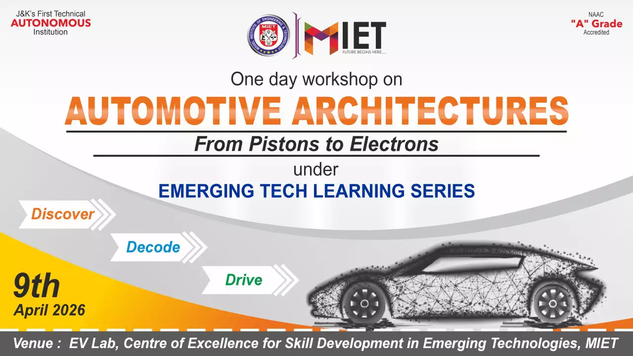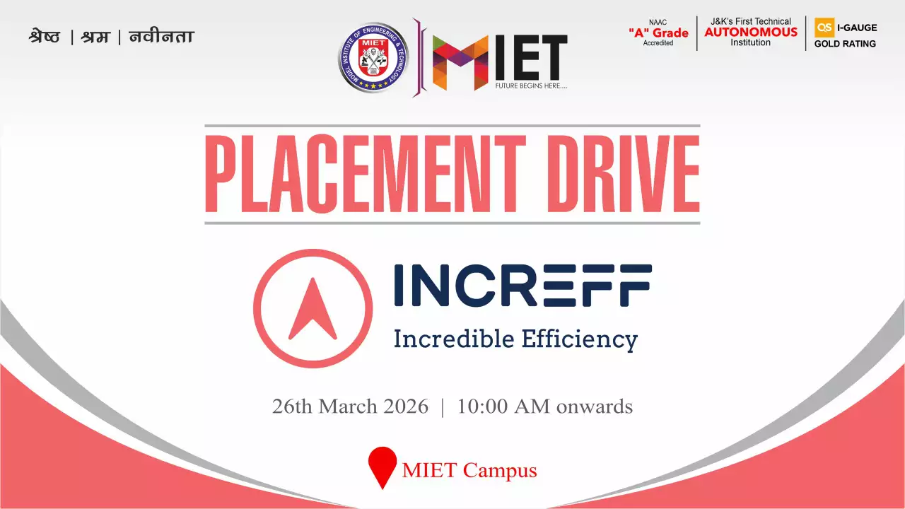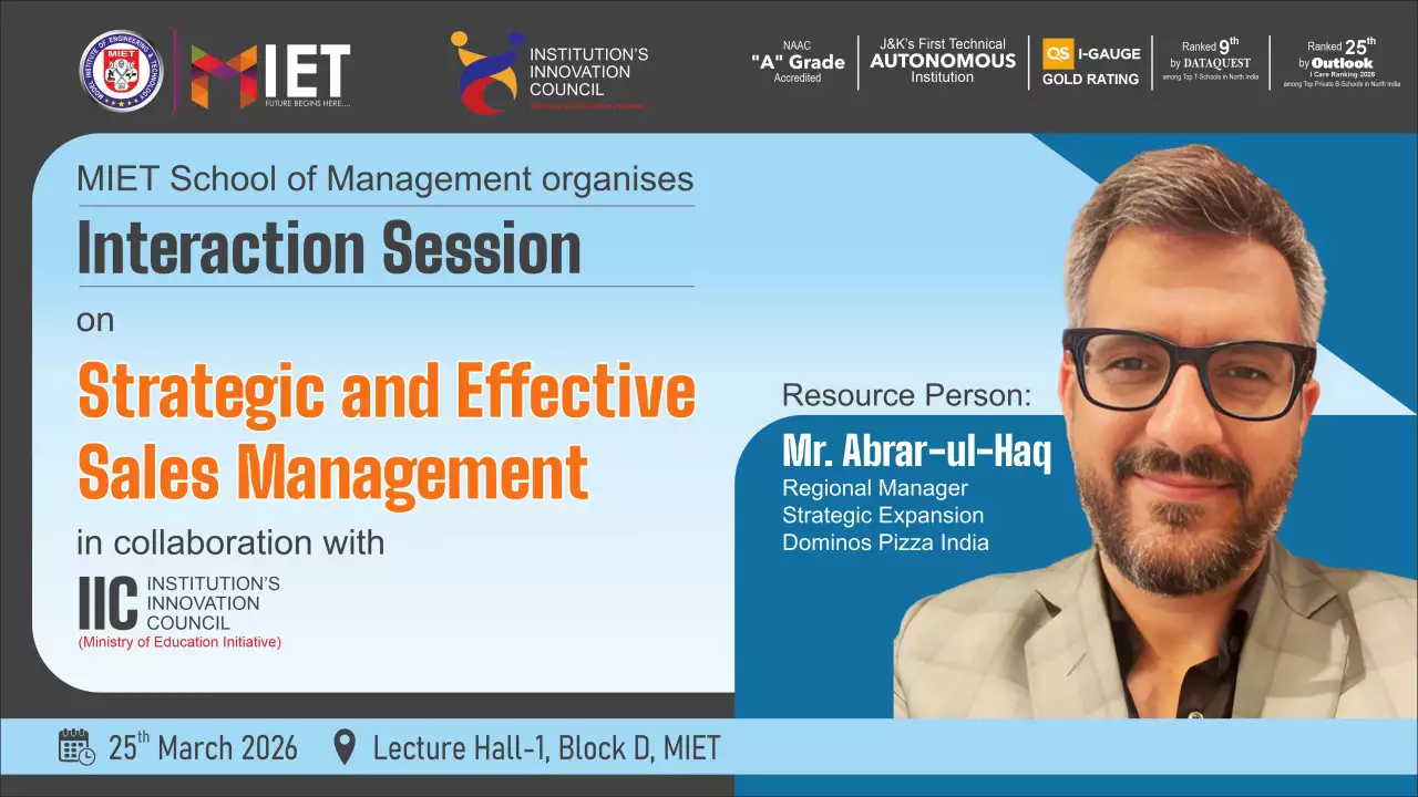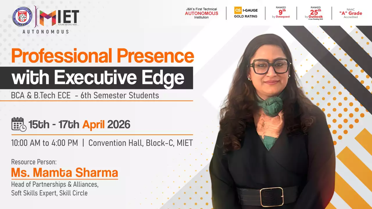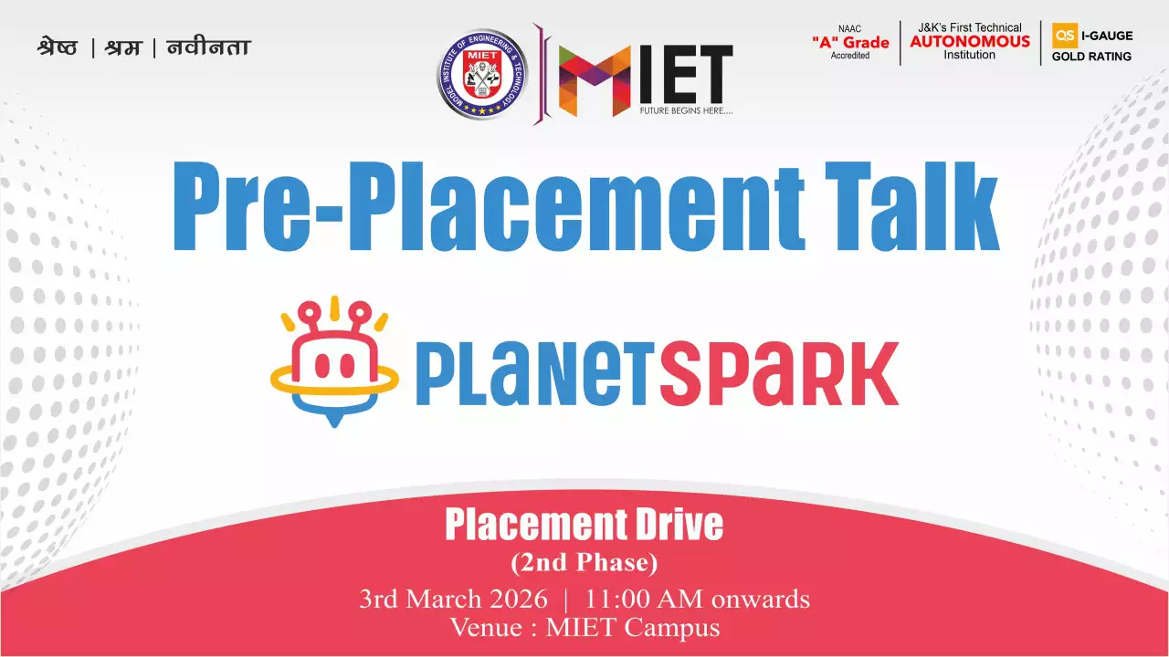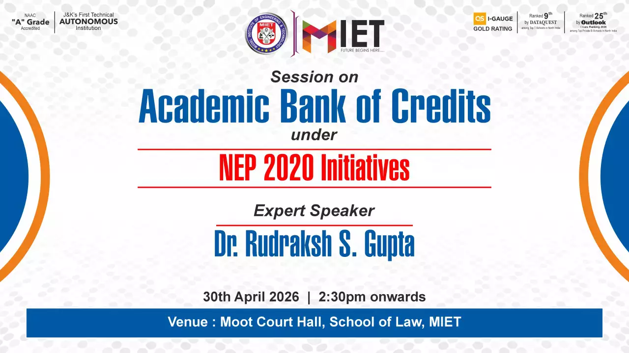 Established in 1999, MIET is the first private engineering college in Jammu and Kashmir. As a UGC approved Autonomous Institution, the institution is committed to fostering academic excellence, innovation, and research. Offering undergraduate, postgraduate, and doctoral programs in Engineering and Technology, Business Administration, Commerce, and Law, the institute emphasizes a cutting-edge curriculum, state-of-the-art infrastructure, and industry collaboration.