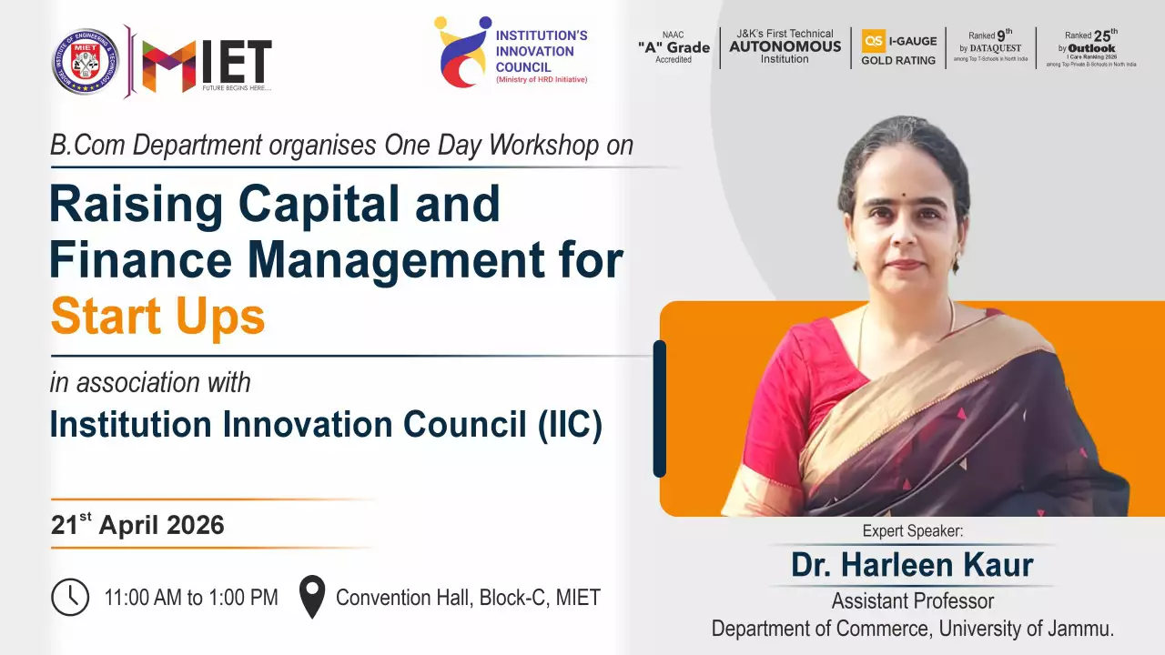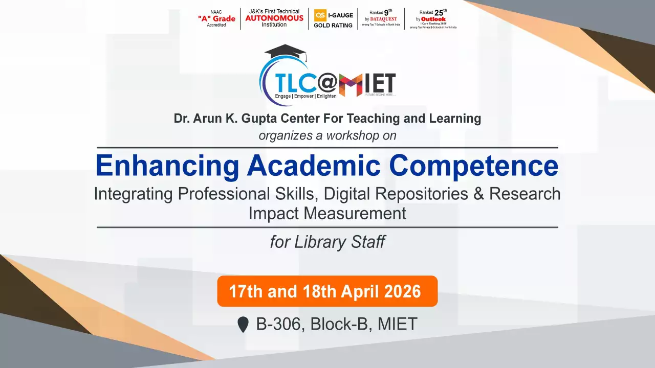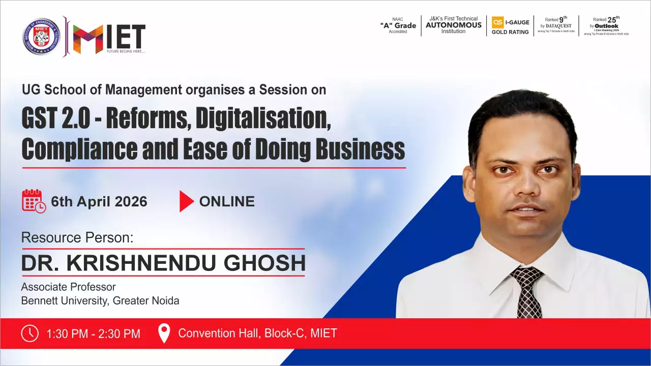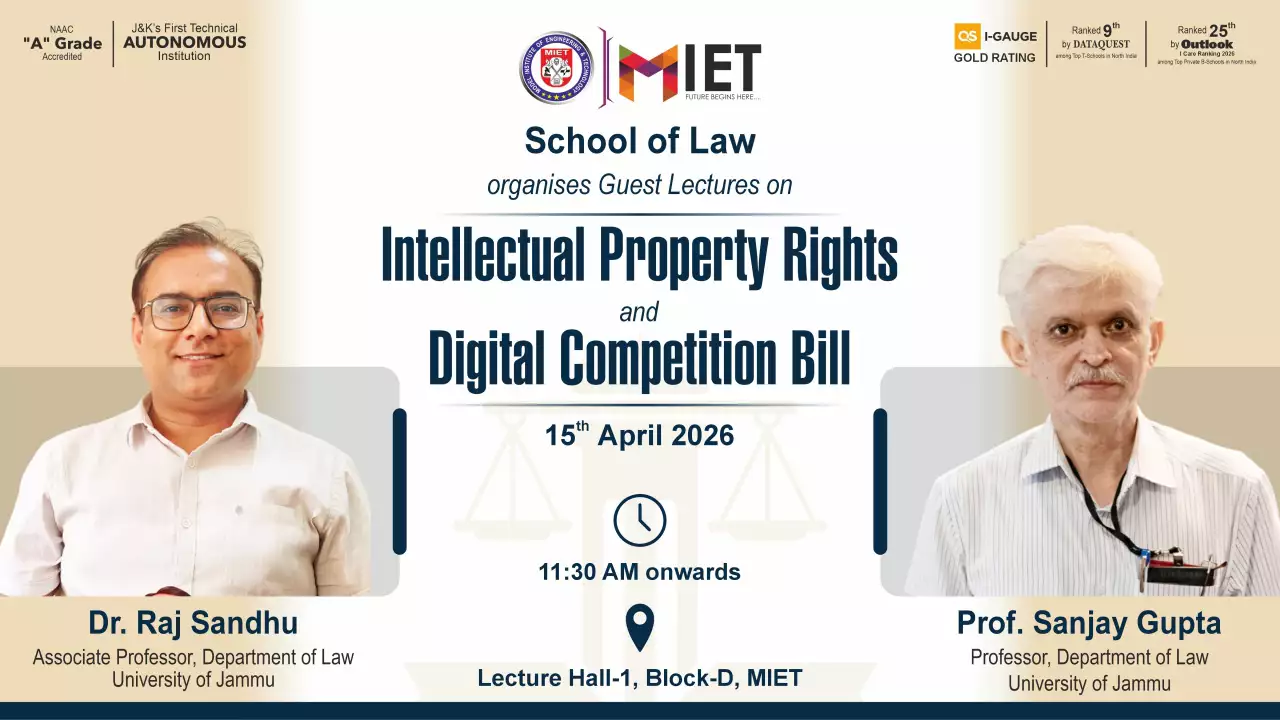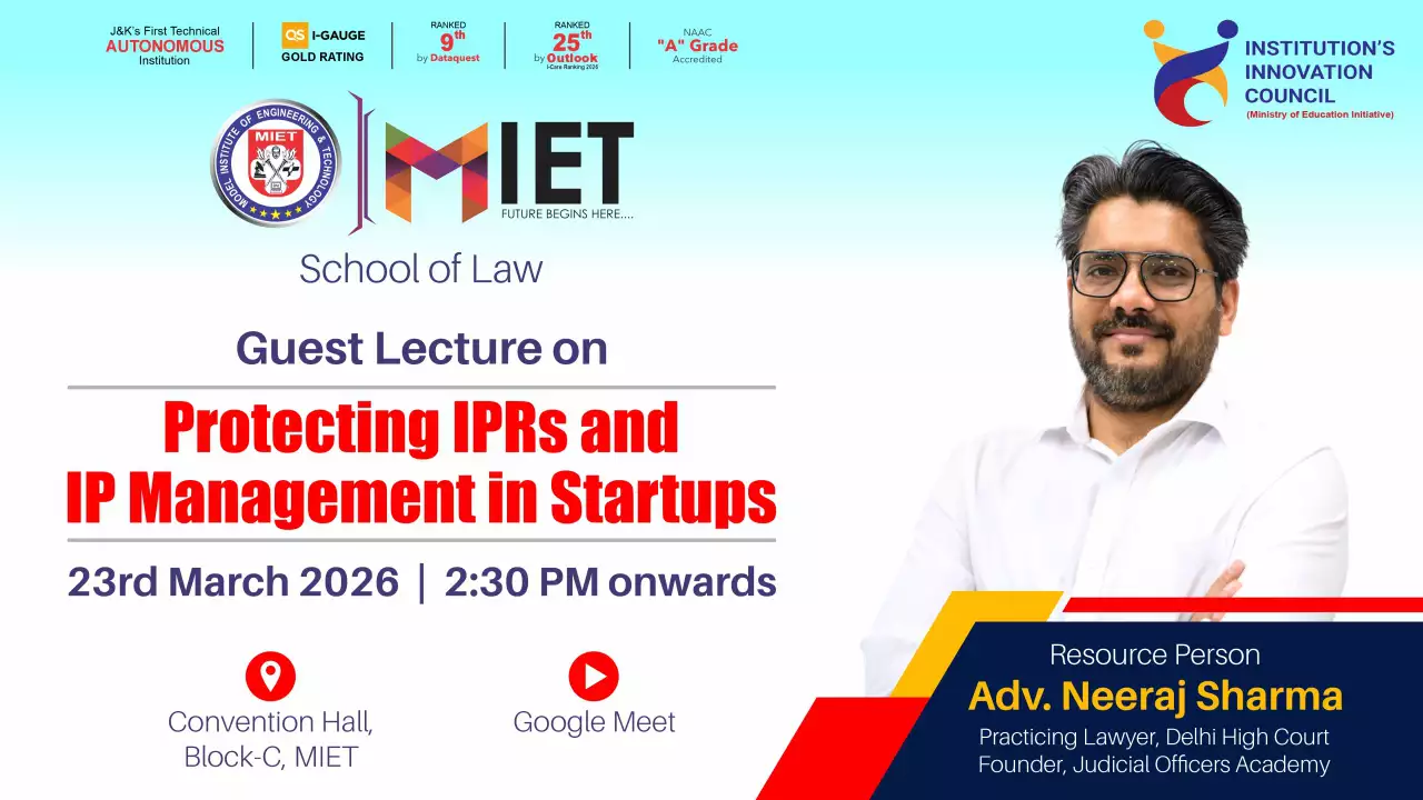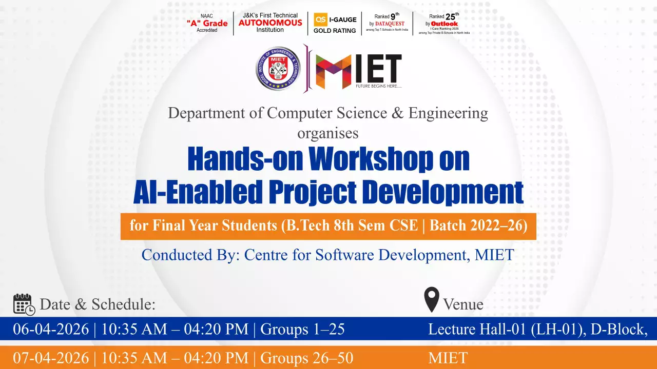 Established in 1999, MIET is the first private engineering college in Jammu and Kashmir. As a UGC approved Autonomous Institution, the institution is committed to fostering academic excellence, innovation, and research. Offering undergraduate, postgraduate, and doctoral programs in Engineering and Technology, Business Administration, Commerce, and Law, the institute emphasizes a cutting-edge curriculum, state-of-the-art infrastructure, and industry collaboration.