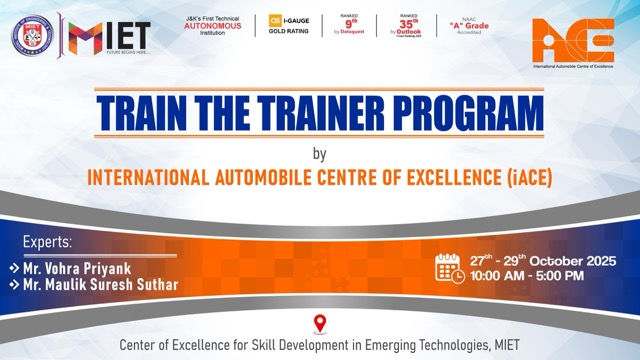 MIET hosted the “Train the Trainer Program” in collaboration with the International Automobile Centre of Excellence (iACE) — a key step towards building faculty expertise in emerging automotive and mobility technologies.