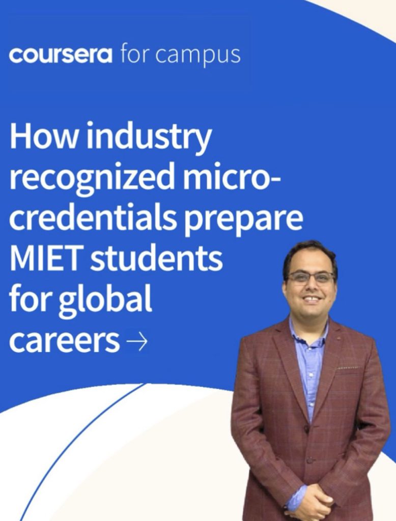 In an endeavour to strengthen the integration of academia with global industry-led digital learning platforms, MIET Jammu has established a strategic academic partnership with Coursera, a leading global online learning platform offering courses from top universities and industry leaders worldwide. This collaboration is aimed at enhancing digital learning capabilities, improving employability, and fostering future-ready skill development among students through access to globally recognized certification programs.