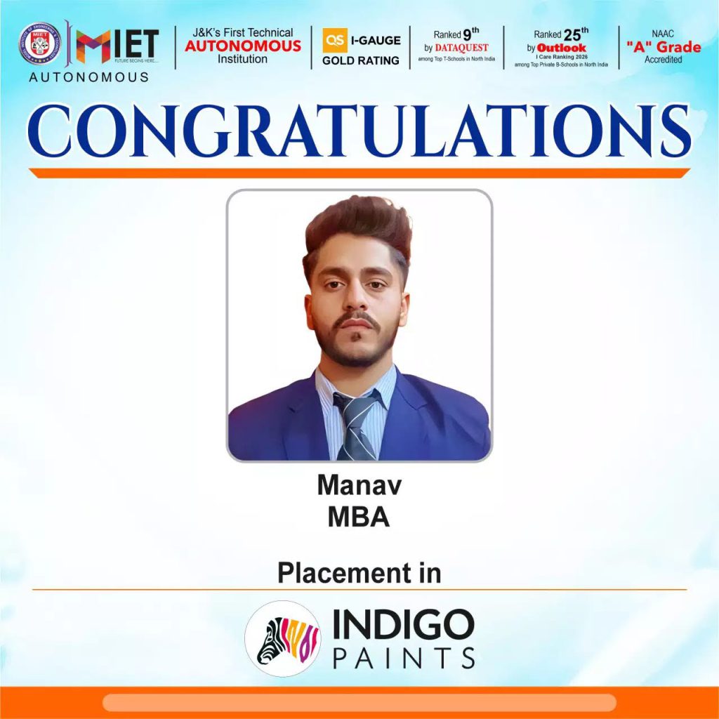 Congratulations to Manav, a final-year MBA student, on securing a placement with Indigo Paints, a reputed name in the industry.